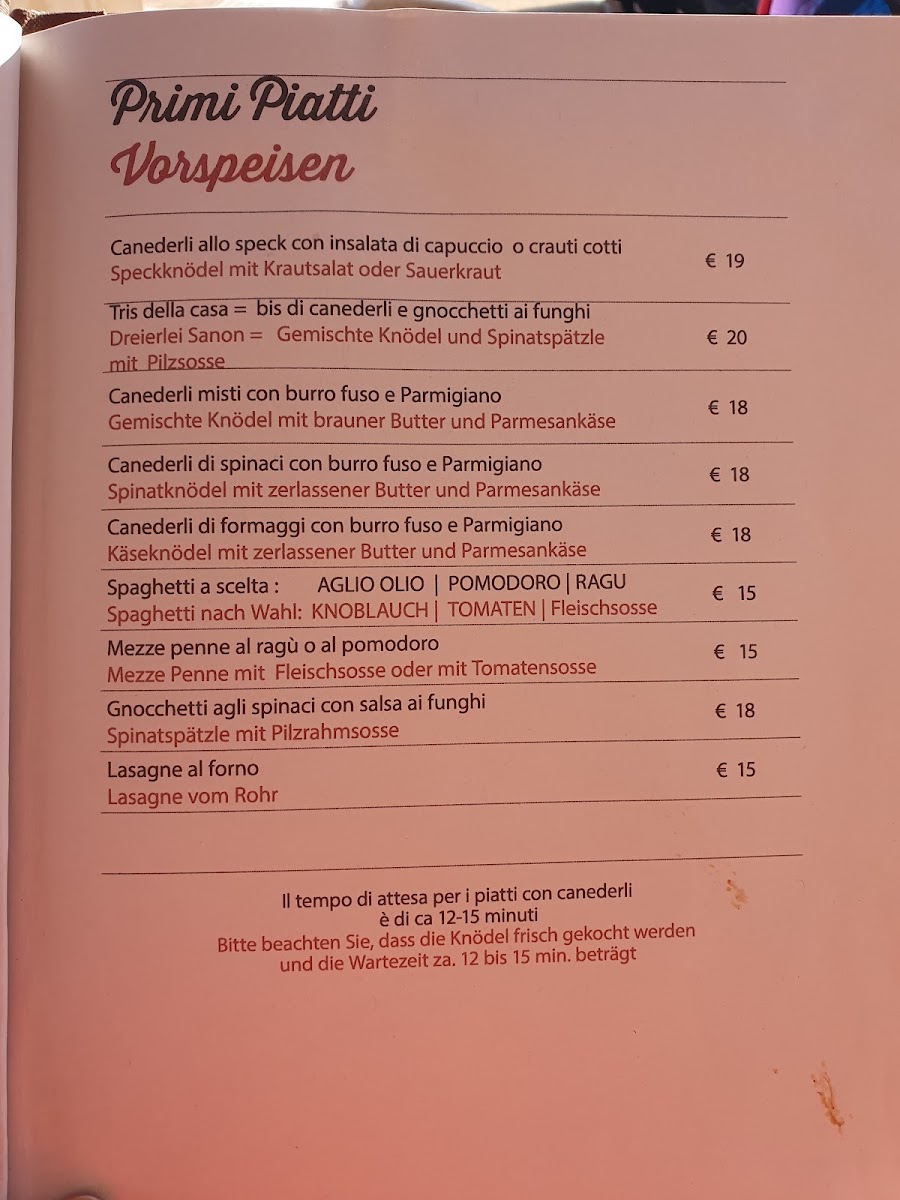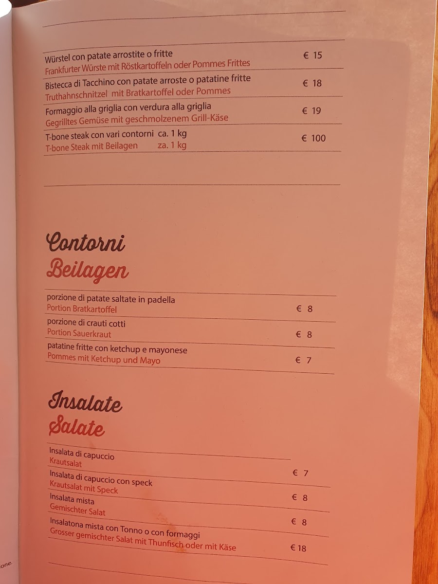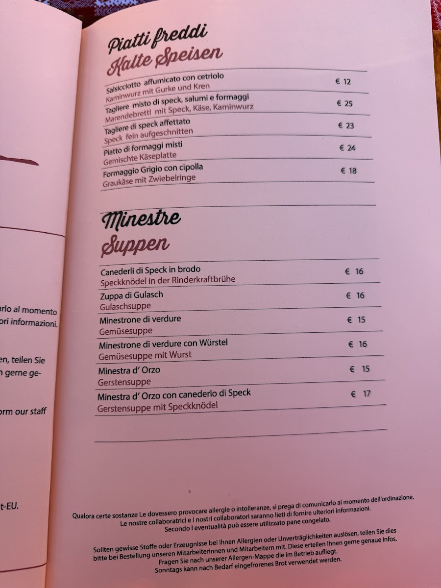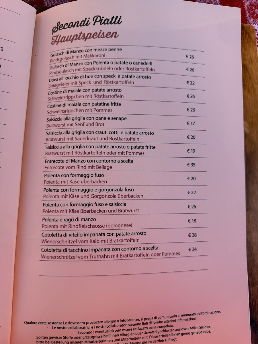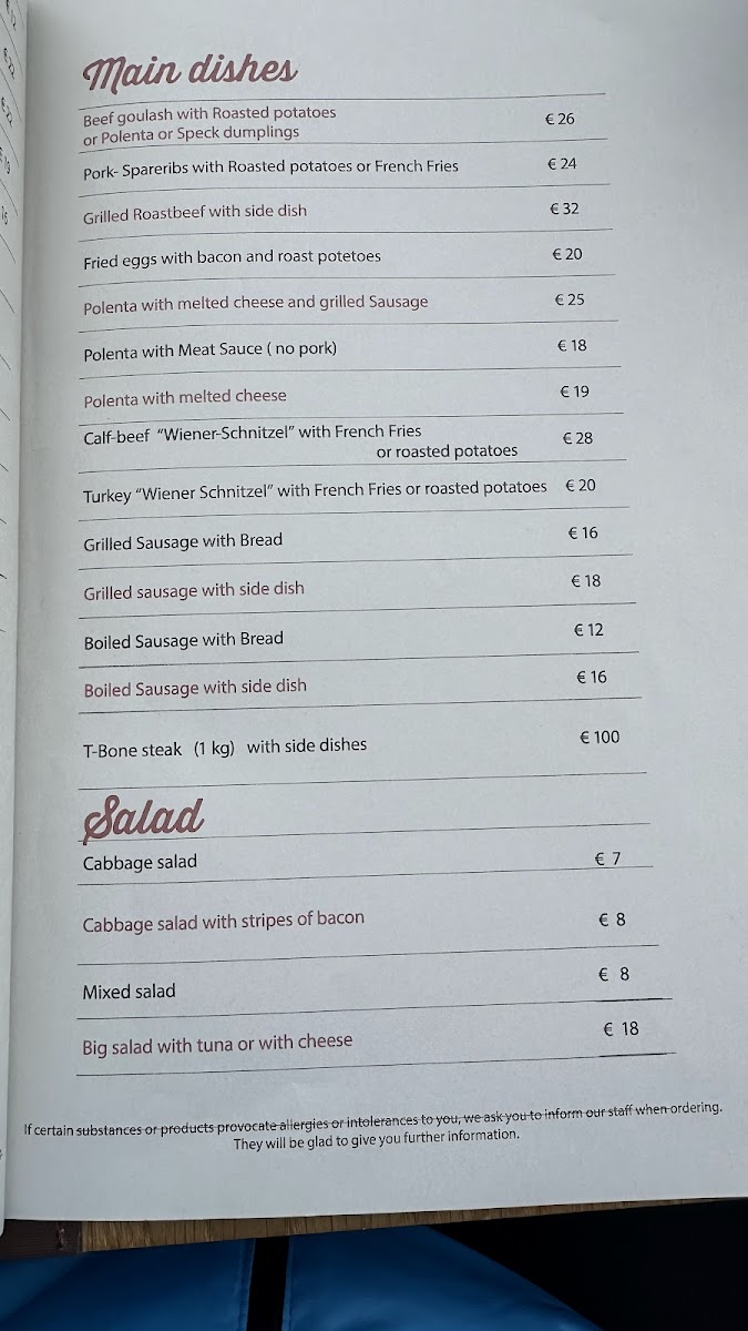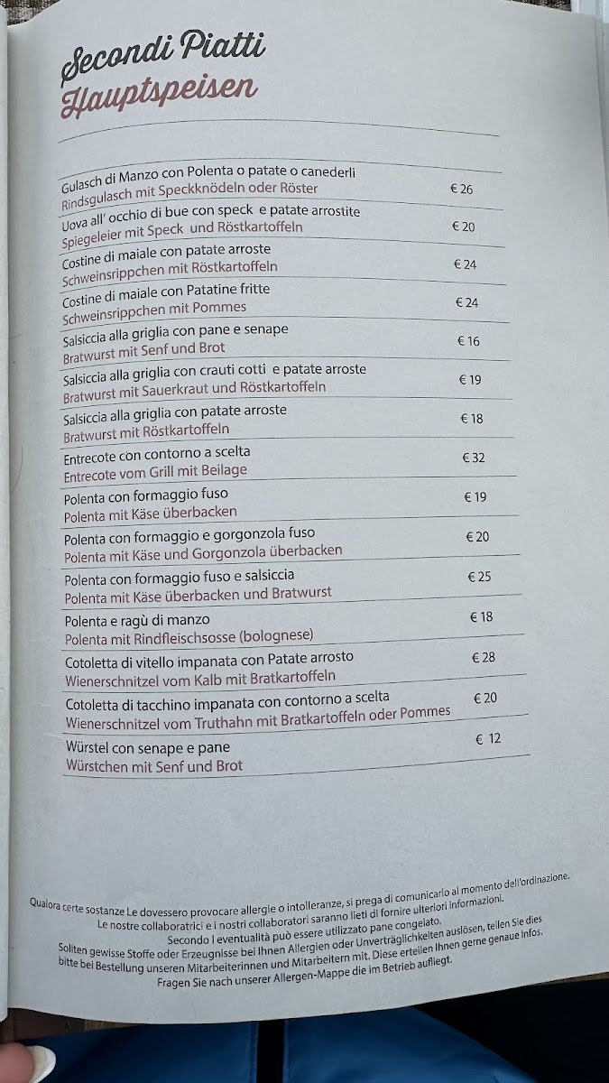 Typical choices include classic Tyrolean specialties like beef goulash paired with speck dumplings and savory fried eggs with bacon and roasted potatoes. Light bites such as bratwurst and smoked sausage feature alongside comforting options like spinach dumplings or spaetzle with porcini mushrooms, providing a balance between richer meals and lighter fare.