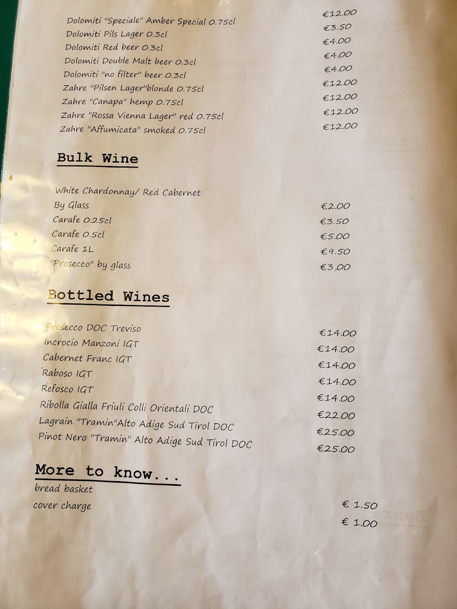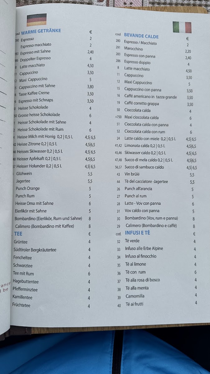 Sweet treats hold an important place on the menu, with various strudels — including apple and ricotta versions — and the fluffy, shredded pancake dessert Kaiserschmarren offering a gentle finish after a meal or a pleasant afternoon indulgence. Drinks range from traditional draft beers like Birra Forst and its lighter Großes Helles variant to classic alpine warm cocktails such as Bombardino. Spritz Aperol adds a bright, refreshing note for those seeking a light aperitif.